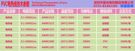 PVC电热线,简称发热线,也有PVC加热丝之称呼,内部多采用镍铬合金,康铜合金,铜镍合金为加热导体,采用PVC为绝缘层,以<Ω/M>为电阻单位,粗细单位<MM>颜色任意可选,产品耐温极限为105℃, 长期80℃以下使用寿命长达8-12年, 产品抗拉和弯曲性能很好,通常可以承受35KG以下的拉力,产品弯曲参考UL758相关标准,以25000次为技术标准,产品成本低廉,被行业认定为适用的加热组件之一
