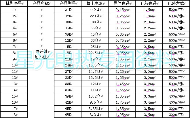 6,碳纤维的电阻属于固定类型,每个规格自身携带的电阻是固定形式的,无法改变,有一定的规律性,设计选用的电压不合适的话,将无法使用,相反合金加热线可以任意改变自身携带的电阻.